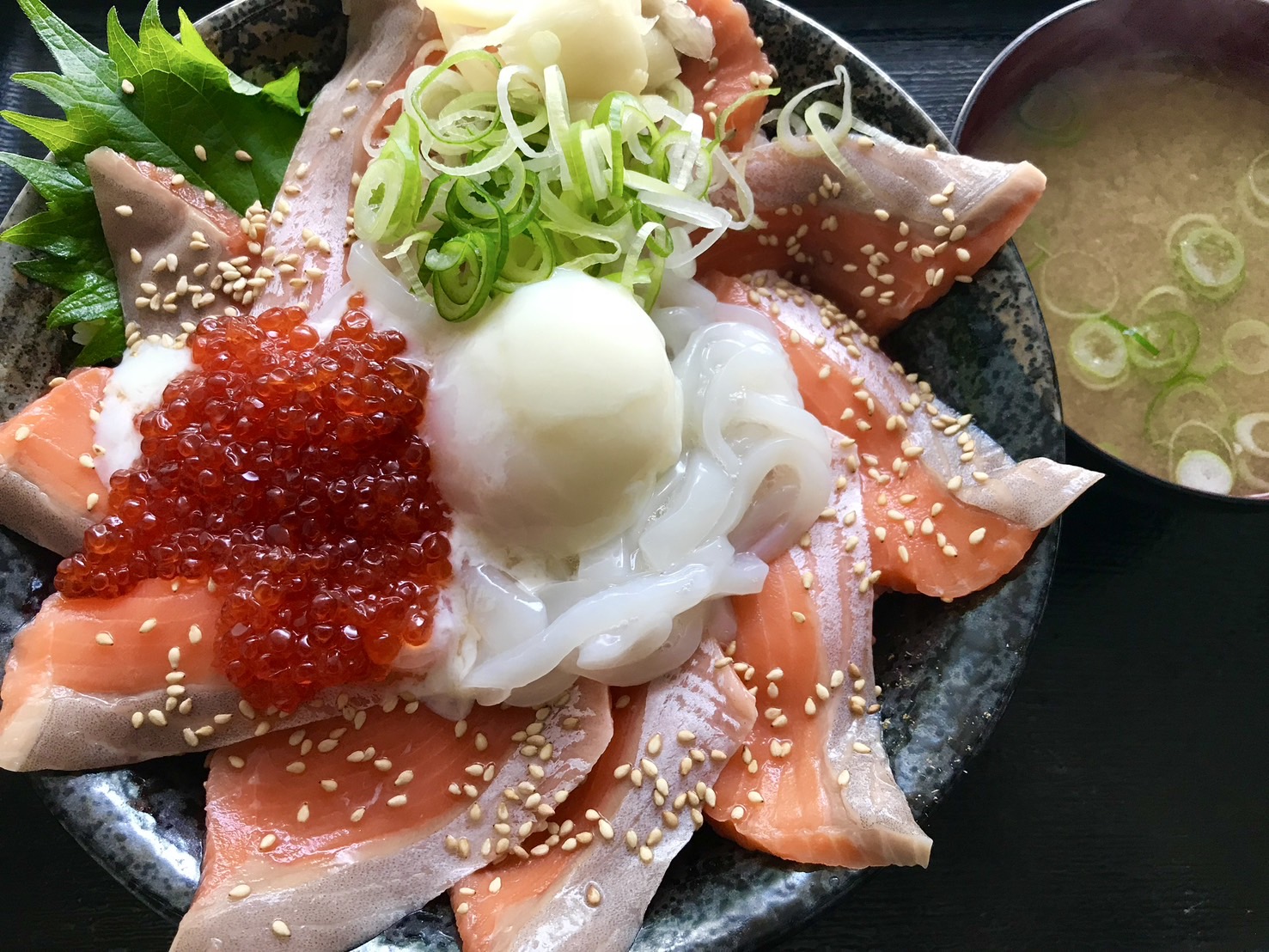 白魚・イカ・イクラ・大山さくら温玉のせです。