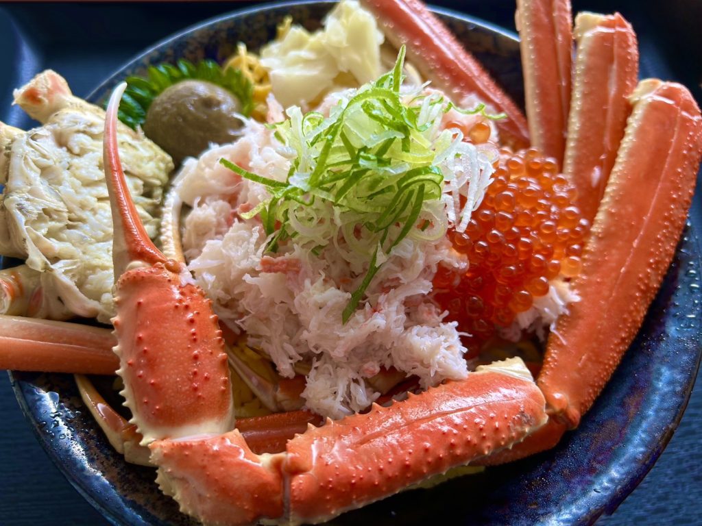 マグロ・サーモン・甘エビ・日替わりのづけ・昆布じめ・いか.白魚・いくら・紅ズワイガニの身・紅ズワイガニのカニ味噌が乗った山芳亭渾身の1杯、境港の海の幸を日吉津村でお届けするスペシャル丼です!